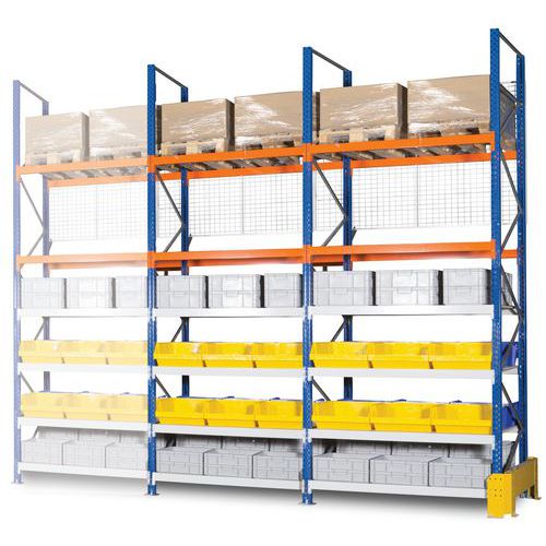 Combinação entre estante de grande alcance com prateleiras e estante de paletes. Armazenamento de paletes em altura, em vigotas retangulares: 1 ou 2 níveis. Armazenamento manual baixo sobre vigotas com entalhe e prateleira em aglomerado: 4 níveis. Cavilha de segurança para bloquear as vigotas: evita quaisquer riscos de desprendimento. Estante robusta mista disponível em 2 versões: sem ou com grelha antiqueda.