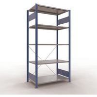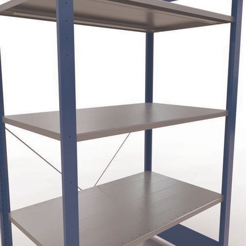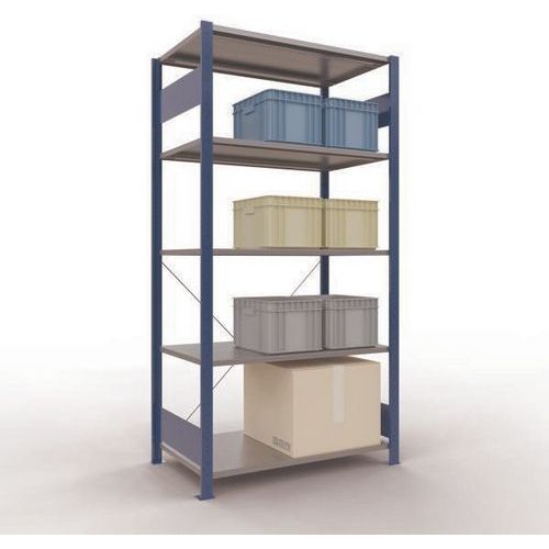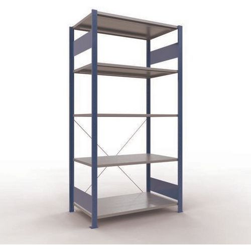 Sistema de estante robusto e bastante completo, com acabamento elegante em tinta epóxi cinzenta ou azul. Prateleiras integrais em chapa de aço capazes de suportar mercadorias de várias dimensões. Estante industrial de montagem fácil e rápida por encaixe, sem necessidade de ferramentas específicas. Estante facilmente extensível acrescentando um ou mais elementos adicionais.