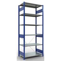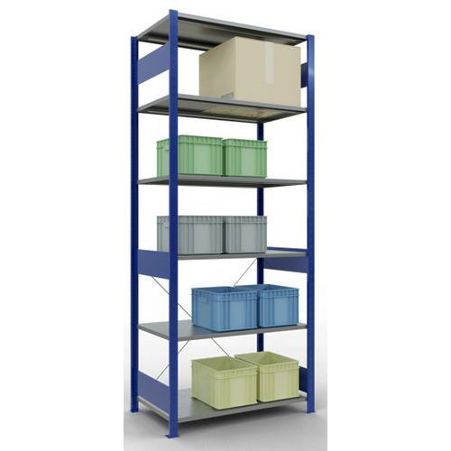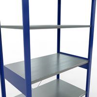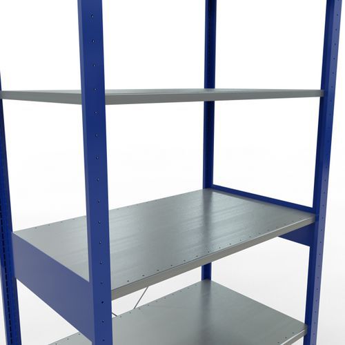 Sistema de estante robusto e bastante completo, com acabamento elegante em tinta epóxi cinzenta ou azul. Prateleiras integrais em chapa de aço capazes de suportar mercadorias de várias dimensões. Estante industrial de montagem fácil e rápida por encaixe, sem necessidade de ferramentas específicas. Estante facilmente extensível acrescentando um ou mais elementos adicionais.