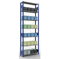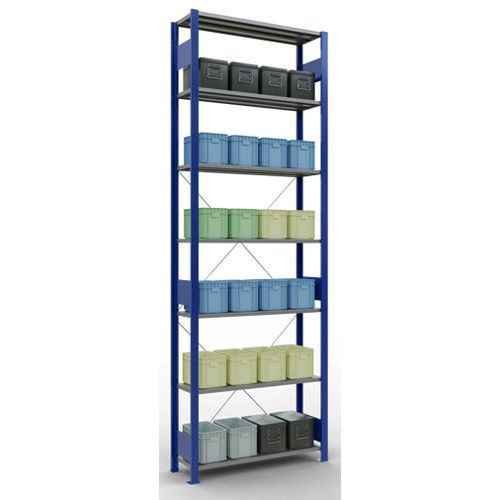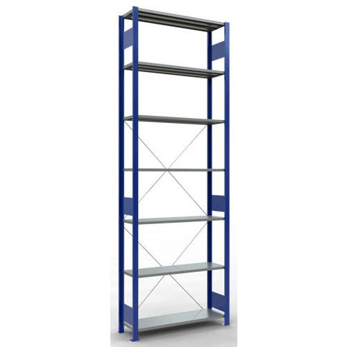 Sistema de estante robusto e bastante completo, com acabamento elegante em tinta epóxi cinzenta ou azul. Prateleiras integrais em chapa de aço capazes de suportar mercadorias de várias dimensões. Estante industrial de montagem fácil e rápida por encaixe, sem necessidade de ferramentas específicas. Estante facilmente extensível acrescentando um ou mais elementos adicionais.
