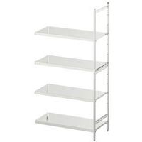 Estante médica em aço inoxidável com prateleira integral em inox. Higiene excecional: material em inox 18/10, qualidade 1.4301. Obturação perfeita dos montantes através de uma tampa de extremidade em PVC. Modulável: configuração de ângulo de 90° através de um gancho, sem necessidade de adicionar uma ilharga. Estante extensível através da adição de um módulo complementar, também designado elemento adicional. Montante com pé de regulação manual de +/- 25 mm. Estante ideal para salas brancas, salas de esterilização e blocos operatórios!