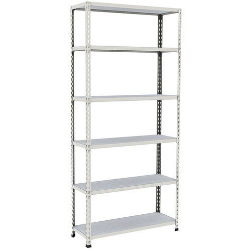 Estante simples e extremamente robusta. Adequada para armazenar caixas de arquivo de grandes dimensões. Prateleira totalmente em aço zincado, material muito resistente em todos os tipos de ambiente. Acabamento em tinta epóxi no montante e na travessa, fácil manutenção, em azul ou cinza claro. Estante de armazém de montagem fácil e rápida, sem necessidade de ferramentas específicas.