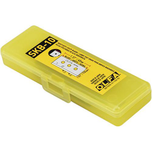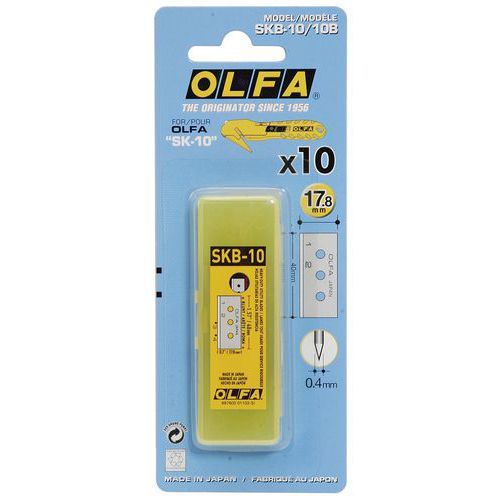 | Nome do artigo | Estojo com 10 lâminas para faca de segurança SKB-10 – Olfa, Material: Aço, Lâmina larg.: 17.8 mm |