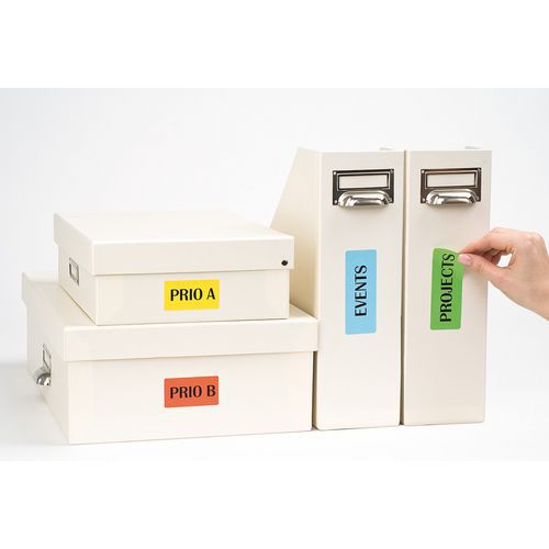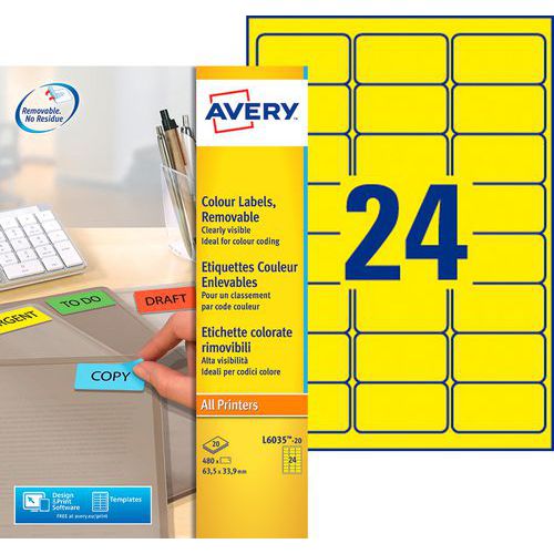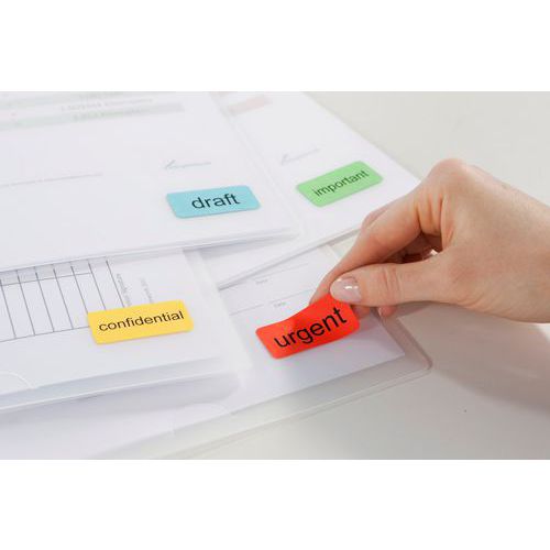 Etiqueta de cor pré-cortada para uma identificação clara e rápida. Remove-se sem deixar vestígios e adere perfeitamente mesmo após várias utilizações. Compatível com todas as impressoras: laser, jato de tinta ou fotocopiadoras.
