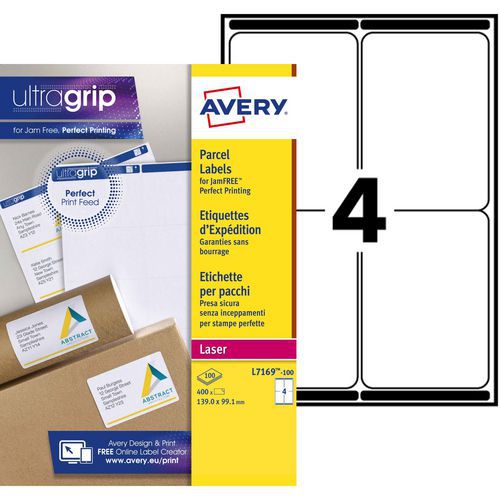 Etiqueta de expedição Ultragrip – impressão a laser, N.º de etiquetas/folha: 4, N.º de etiquetas: 400 Etiqueta de expedição Ultragrip – impressão a laser, N.º de etiquetas/folha: 4, N.º de etiquetas: 400