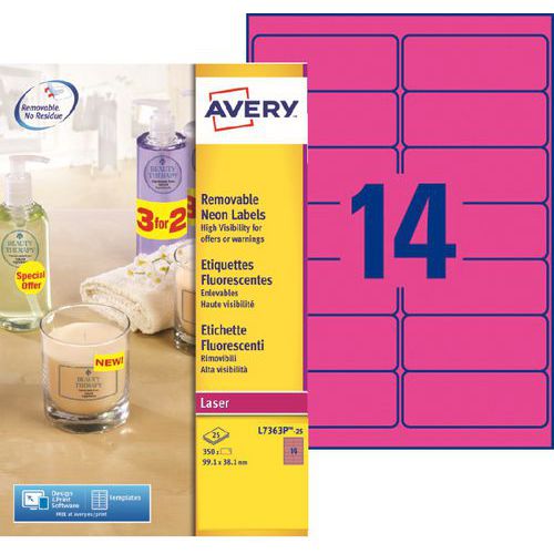 Etiqueta fluorescente reposicionável Avery – Impressão a laser, N.º de etiquetas/folha: 14
