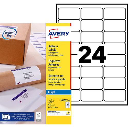 Etiqueta padrão – Impressão a jato de tinta, N.º de etiquetas/folha: 24, N.º de etiquetas: 960 Etiqueta padrão – Impressão a jato de tinta, N.º de etiquetas/folha: 24, N.º de etiquetas: 960