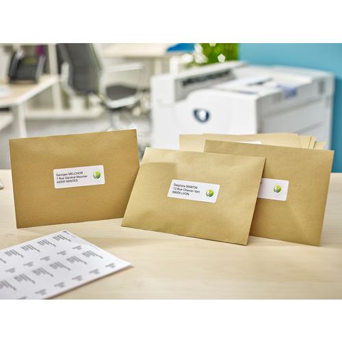 Etiqueta reciclada e branqueada sem cloro e fácil de descolar do suporte. Compatível com todas as marcas de impressoras a laser. Cantos redondos.
