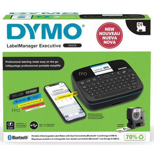 Etiquetadora profissional LabelManager® Executive LM640 CB QWY – Dymo versátil. Etiquetadora portátil e recarregável com conetividade dupla. Compatível com as etiquetas D1 Standard e Durable e com 6, 12, 19 e 24 mm de largura. Portabilidade sem esforço graças a uma bateria de iões de lítio recarregável. Design pouco volumoso com dimensões compactas e uma superfície texturizada para um manuseamento ergonómico.