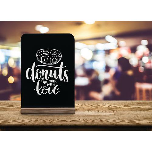 Ardósia de mesa com suporte em pinho e dupla face em preto fácil de limpar.