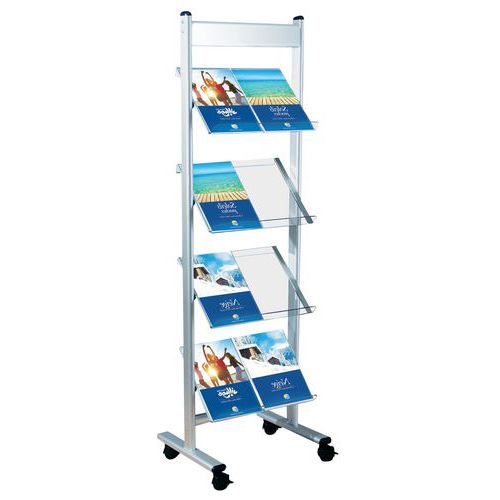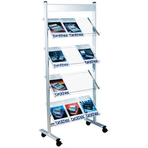 Expositor para brochuras com caixilho em aço. Equipado com 4 rodízios giratórios com travão. Prateleiras em vidro acrílico de qualidade superior.