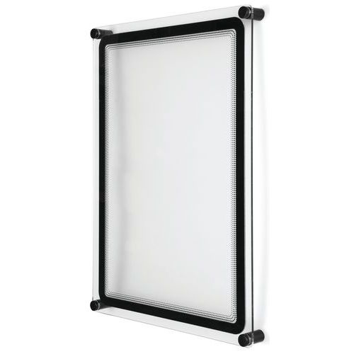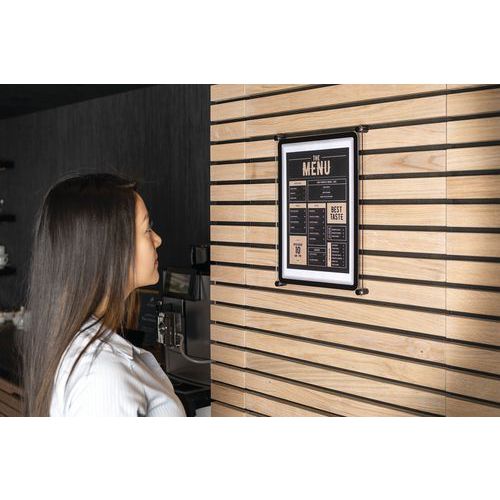 O expositor para cartaz de parede Crystal com quadro de exposição Magneto enquadra e apresenta o documento na perfeição.