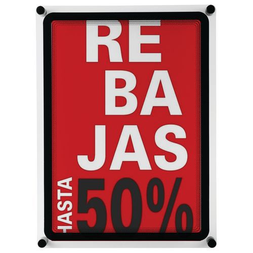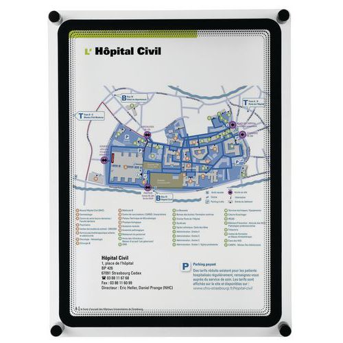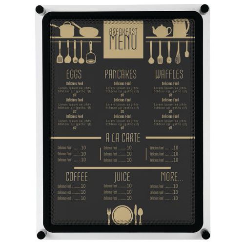 Pode ser montado numa parede ou porta como expositor para cartaz ou placa sinalética.