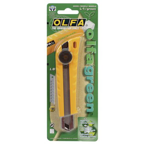 | Nome do artigo | Faca segurança esp. alcatifa L-1 green – lâmina de 18 mm – Olfa, Lâmina retráctil: sim, Uso alimentar: não |