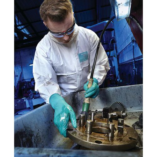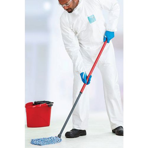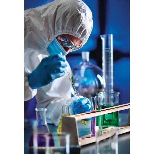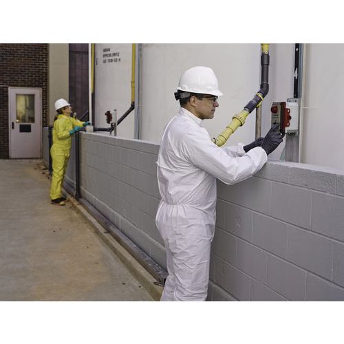 Fato de proteção em SMMS ignífugo e antiestático, que proporciona aos utilizadores uma proteção química leve.