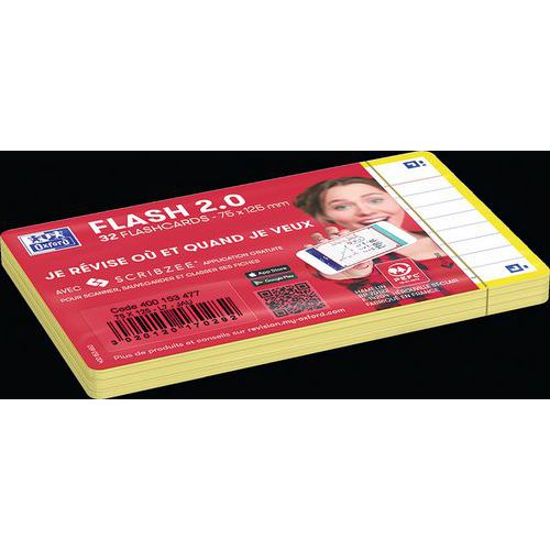 As fichas Bristol Flash 2.0 75x125 mm pautadas permitem estudar, anotando nos seus flashcards FLASH 2.0 uma pergunta na parte frontal e a respetiva resposta na parte traseira. Método de pergunta/resposta, para memorizar o máximo de informações de cor. Teste-se a si mesmo regularmente para reativar a sua memória e assimilar os seus conhecimentos a longo prazo. O Scribzee® é uma aplicação gratuita para digitalizar, guardar e organizar os seus cartões Flash 2.0. Uma cor de cartão por matéria permite guardar e encontrar mais facilmente as suas fichas por tema ou matéria.