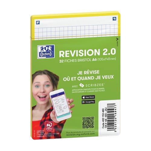 Fichas Bristol Revision 2.0 Oxford A6 Q5x5 com rebordo compatíveis com a aplicação Scribzee. O Scribzee® é uma aplicação gratuita para digitalizar, guardar e organizar as suas fichas no smartphone. Uma cor de rebordo por matéria permite classificar e localizar melhor as suas fichas por tema ou matéria. Ideal para organizar as suas fichas no seu smartphone sem perder tempo. Cantos arredondados para que as fichas não se dobrem.