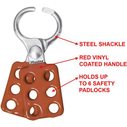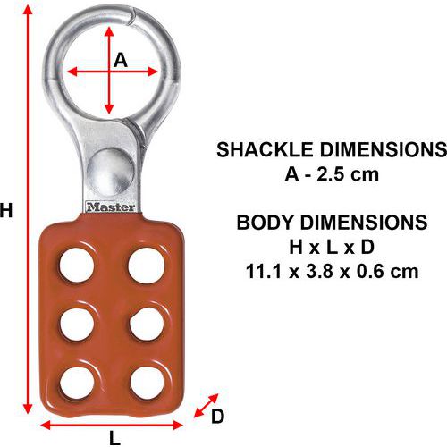 - O gancho de segurança em alumínio Master Lock n.º 416 tem um diâmetro de garra interior de 25 mm e pode conter até seis cadeados.