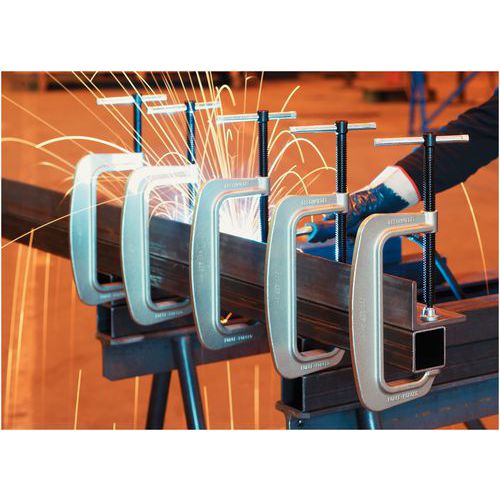 Patim de aperto fixo ranhurado para uma total fixação. Prensa em C segura por uma rótula móvel com parafuso. Corpo zincado contra a corrosão. Cabeça de parafuso monobloco para uma estabilidade óptima da ferramenta. Fecho do parafuso a 0 para uma capacidade de aperto máxima.