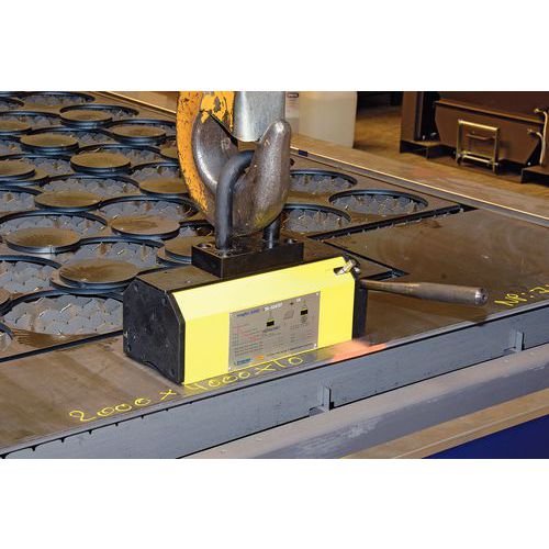 O transportador é acionado por uma alavanca de engate ergonómica e robusta. Um sistema de segurança bloqueia a alavanca de modo a evitar que o íman se desloque. Cada íman está equipado com um anel de fixação para o gancho da ferramenta de elevação.