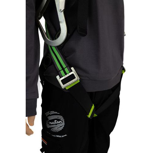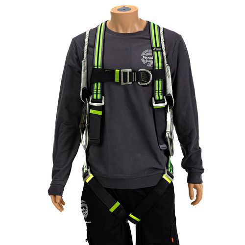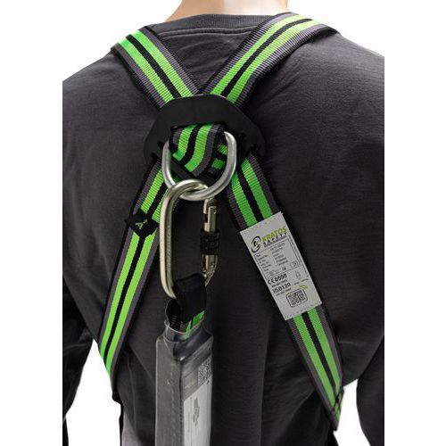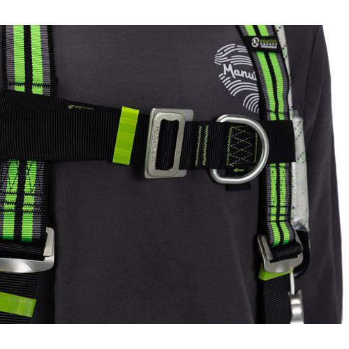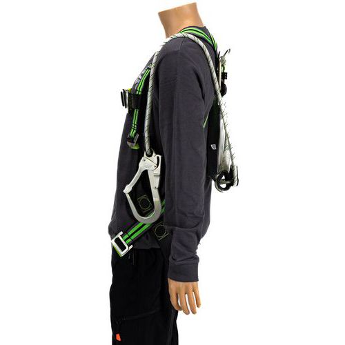 Kit composto por: 1 arnês, 1 correia dupla com absorvedor de energia, 1 mochila.