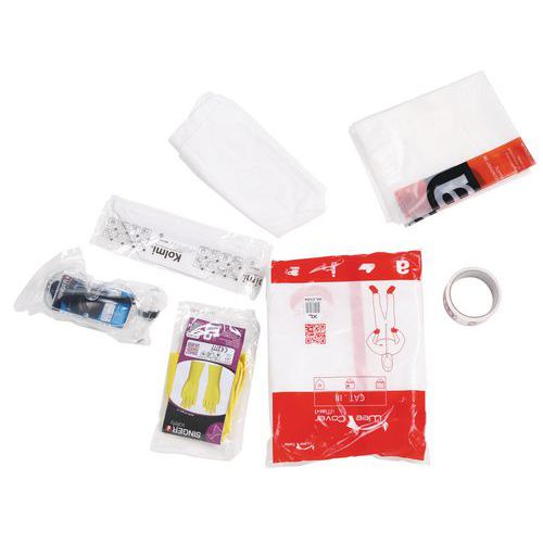 Kit composto por: 1 fato de tipos 5 e 6, EPI. Equipamento de proteção individual, categoria III, não tecido 1 par de luvas, amarelas, classificadas EPI. 1 semimáscara dobrável com fltro, em conformidade com a norma EN149:2001, classe FFP3 1 par de óculos-máscara, norma EN166 1 par de coberturas para botas WeePro 1 saco de resíduos com logótipo de amianto 90 x 110 cm – 65 mícrones 1 rolo adesivo, 48 mm x 33 m para fechar o saco de resíduos e fixar as junções entre os acessórios e o fato 1 saco com fecho para embalagem dos elementos do kit considerados resíduos após a utilização.