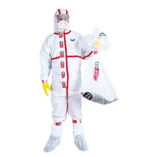 Kit composto por: 1 fato de tipos 5 e 6, EPI. Equipamento de proteção individual, categoria III, não tecido 1 par de luvas, amarelas, classificadas EPI. 1 semimáscara dobrável com fltro, em conformidade com a norma EN149:2001, classe FFP3 1 par de óculos-máscara, norma EN166 1 par de coberturas para botas WeePro 1 saco de resíduos com logótipo de amianto 90 x 110 cm – 65 mícrones 1 rolo adesivo, 48 mm x 33 m para fechar o saco de resíduos e fixar as junções entre os acessórios e o fato 1 saco com fecho para embalagem dos elementos do kit considerados resíduos após a utilização.