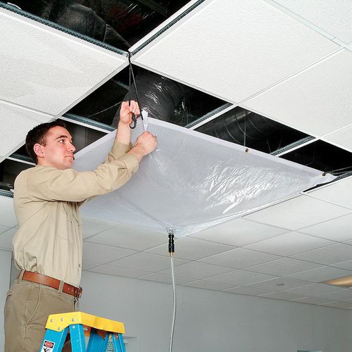 Estes kits de balde de desvio de fugas portáteis são perfeitos para uma intervenção rápida em caso de fugas em altura. Contém o material necessário para uma intervenção rápida em caso de fuga proveniente do teto, com um balde de 24,6 litros. A tampa do balde integra uma tampa amovível que permite inserir o tubo de evacuação sem necessidade de retirar a tampa. O balde pode ser utilizado como recipiente de recolha do líquido desviado, a mensagem Cuidado impressa também serve como painel de aviso. A cobertura impermeável está revestida em vinil para maior robustez e durabilidade, sendo resistente a perfurações, aos raios UV e ao bolor para uma longa vida útil.