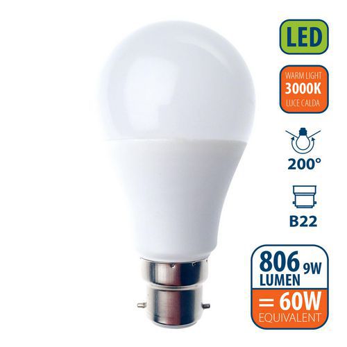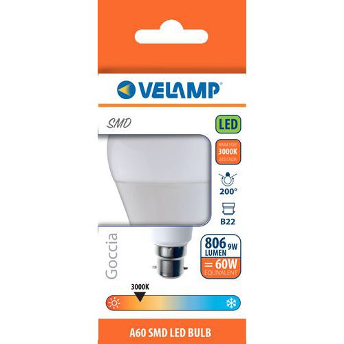 Lâmpada LED SMD padrão A60 de 9 W com casquilho B22 – VELAMP