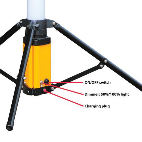 Utilizada como iluminação principal para iluminar uma divisão ou um espaço exterior. Potente: equipado com LED SMD de alta eficiência que dissipam o calor, a lâmpada com tripé recarregável desenvolve 6000 lúmenes (54 W) de luz a um ângulo de 360º.