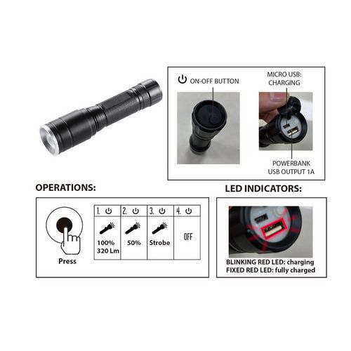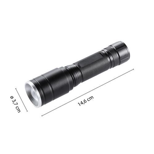 Contém: 1 lanterna LED recarregável de 5 W com função de zoom, 1 bateria recarregável (bateria de iões de lítio 18650 3,7 V 1200 mAh), 1 cabo micro USB de 50 cm. A Velamp é um especialista em lanternas: todos os valores indicados a seguir são reais: a lanterna está equipada com um LED de alta potência de 5 W e 320 lúmenes.