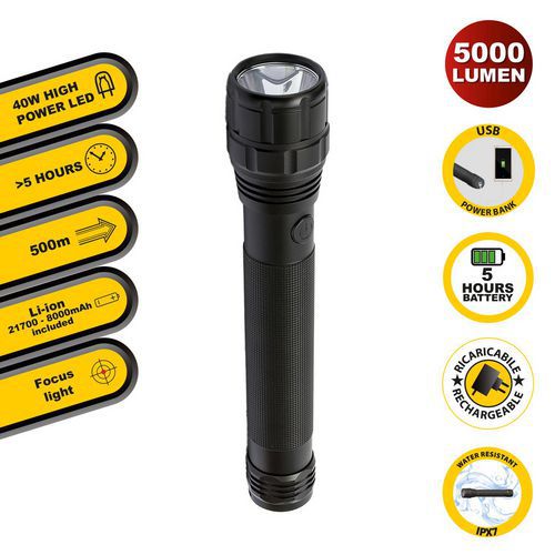 Fabricada em alumínio de qualidade A extremamente leve e resistente. Com estanqueidade IPX7, pode ser utilizada em espaços interiores e exteriores. Feixe focalizado extremamente potente. Equipada com a função de powerbank, pode recarregar os seus dispositivos onde quer que esteja. Inclui um cabo USB de 50 cm. Perfeita para utilizar em caminhadas, acampamentos, no carro, no trabalho, em estaleiros e pelas forças de segurança e por profissionais.