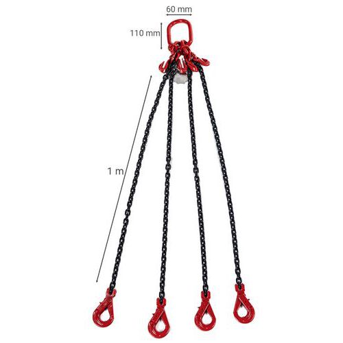 Linga de elevação de 4 secções com corrente e capacidade de 236 kg. Composta por aço de elevada resistência ao calor e insensibilidade ao frio de grau 8. Coeficiente de segurança 4 com carga de rutura de 944 kg, em conformidade com a norma EN818-4. Gancho com fecho automático para garantir maior segurança.