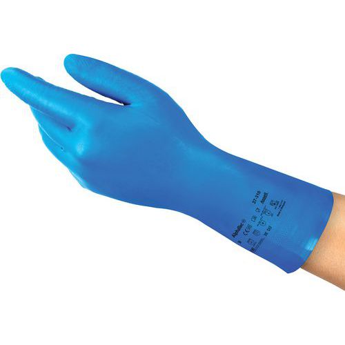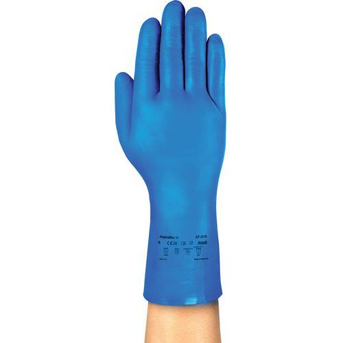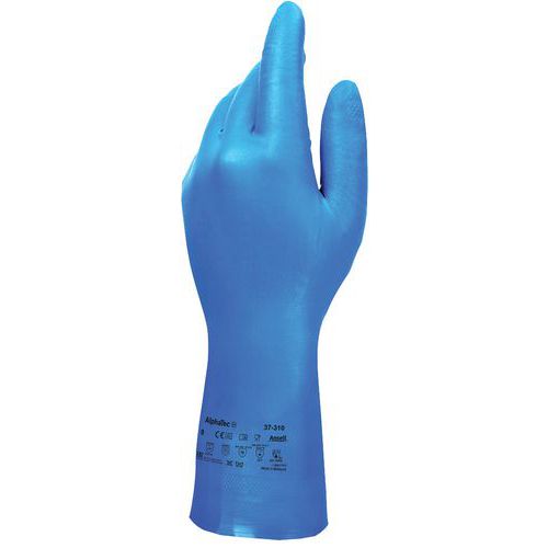 As luvas EPI AlphaTec® 37-310 têm proteção química EN 374 Tipo B contra ácidos leves, lubrificantes, óleos e líquidos.