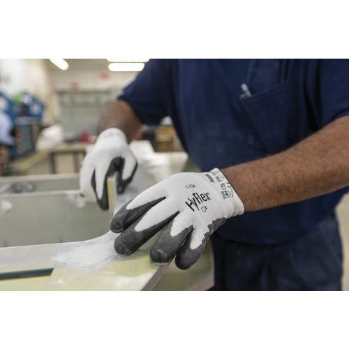 O revestimento em PU na palmadas luvas de trabalho industriais HyFlex® 11-724 garante uma excelente aderência em condições oleosas leves.