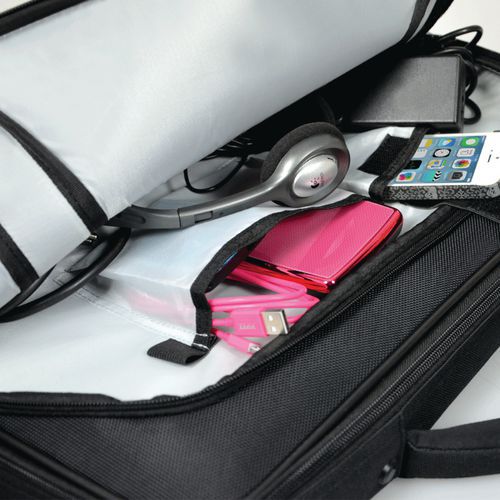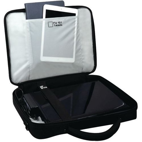 Mala para computador com abertura frontal e compartimento próprio para tablet.