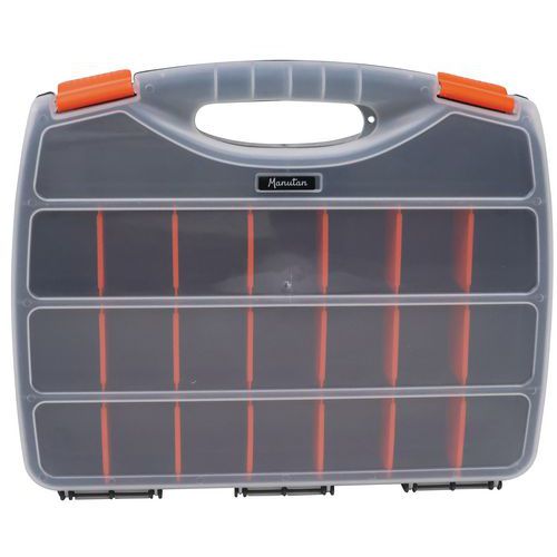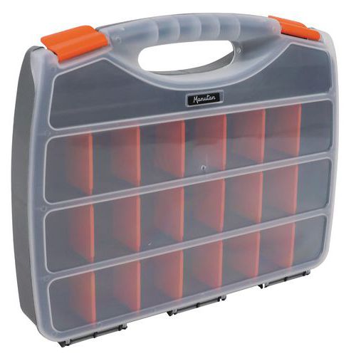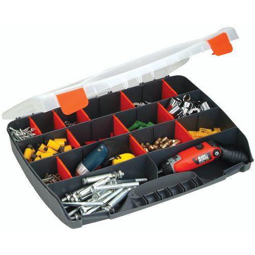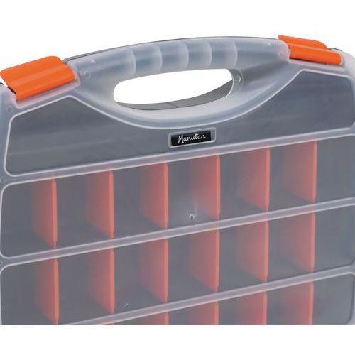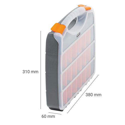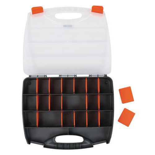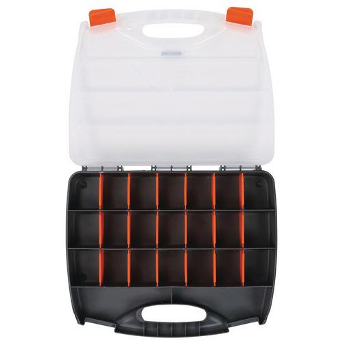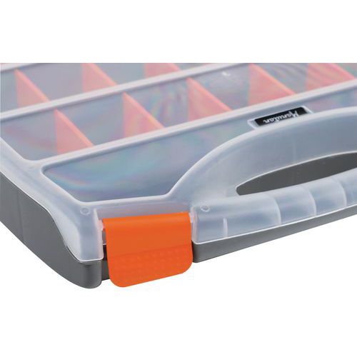 Maleta com divisórias, fácil de transportar, com 2 fechos ao nível da pega. Os compartimentos podem ser divididos em 25 compartimentos pequenos, com divisórias amovíveis. Tampa transparente para identificar rapidamente o conteúdo.