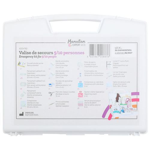 | Nome do artigo | Maleta de primeiros socorros multirriscos universal 5/10 pessoas – Manutan Expert, Cores: Branco |