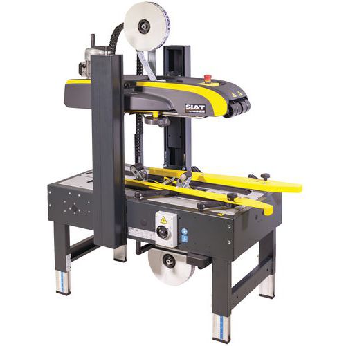 Máquina semiautomática para fechar caixas de cartão.