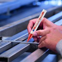 Marcador colorido – Edding 750 para escrever de forma permanente e com elevado nível de cobertura, mesmo em materiais escuros e transparentes. Marcação em metal, vidro, plástico, etc. e sobretudo em todas as superfícies lisas. Secagem rápida da tinta, odor reduzido. Resistente à água, à luz, ao calor até 400 °C (1000 °C para determinadas cores, como o branco, amarelo, prateado) e resistente à abrasão. Caudal de tinta controlado pela válvula do marcador. Isento de tolueno/xileno.