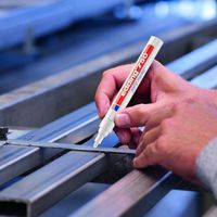 Marcador colorido – Edding 750 para escrever de forma permanente e com elevado nível de cobertura, mesmo em materiais escuros e transparentes. Marcação em metal, vidro, plástico, etc. e sobretudo em todas as superfícies lisas. Secagem rápida da tinta, odor reduzido. Resistente à água, à luz, ao calor até 400 °C (1000 °C para determinadas cores, como o branco, amarelo, prateado) e resistente à abrasão. Caudal de tinta controlado pela válvula do marcador. Isento de tolueno/xileno.
