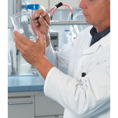 Marcador permanente concebido para marcações precisas e finas em superfícies lisas e transparentes, como lâminas de microscópios, tubos de ensaio, etc.