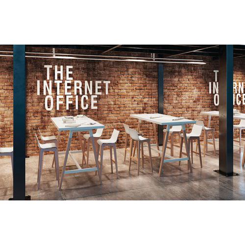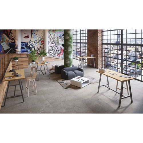 As mesas altas Cohésion adaptam-se aos novos modos de trabalho em pé, incentivando a troca de impressões e a colaboração. Os acabamentos naturais dos tampos, aliados às bases em trapézio de metal, conferem um estilo industrial. Tampos em painéis alveolares com espessura de 38 mm, com tratamento antirreflexos e antirriscos, com propriedades antibacterianas. Bases em metal com arco A montadas por travessas estruturais. Cantos ABS antichoque de 2 mm.