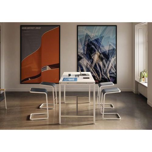 - A mesa alta em melaminado antirriscos e antirreflexos é adequada para o móvel de trabalho em grupo.
