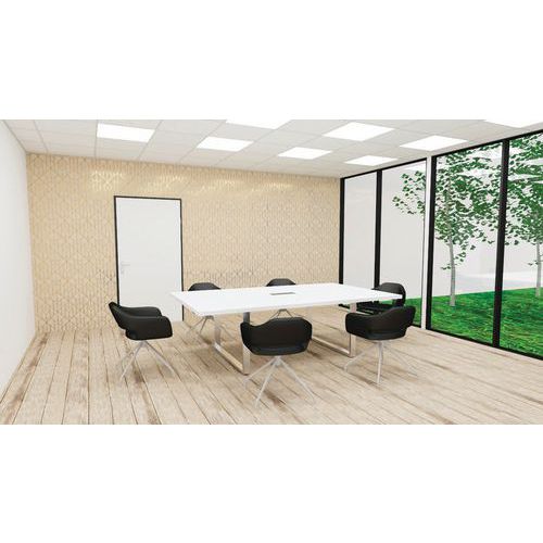| Dados técnicos | Dimensões: P140 x A73,5 x C240 cmMesa de reuniões com tampo alveolar, espessura de 38 mm, canto em ABS de 2 mm. Base com arco em metal, friso em secção de 70 x 30 mm, desenvolvida a partir de um sistema de viga autoportante. Parafusos de estabilidade reguláveis em 10 mm. |