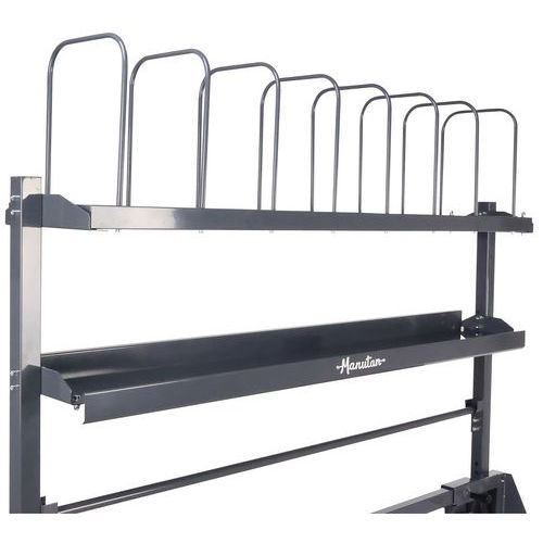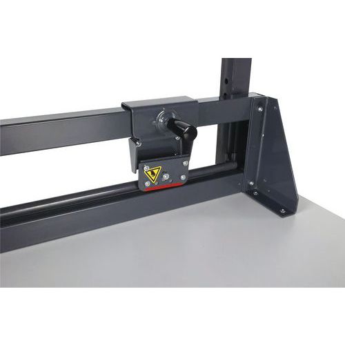 Composição: – 1 tampo em melamina (20 mm de espessura) – 2 bases (800 x 800 mm) – 1 eixo desenrolador sobre a mesa (C 1375 mm) – 1 bandeja metálica para acessórios, ajustável em altura (1400/1500 mm) – 1 bandeja metálica com 8 separadores, ajustável em altura (1800/1900 mm) – 1 barra de corte protegida – 1 eixo desenrolador adicional debaixo da mesa