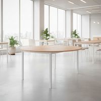 Mesa de reuniões estável. Pés antiderrapantes reguláveis. Formato semirredondo para que a possa adaptar às suas mesas estáveis e fixas.