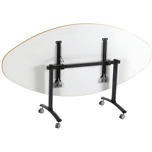 A mesa de reuniões oval dobrável Axe com tampo rotativo permite poupar espaço ao armazenar. Bloqueio automático do tampo nas posições de trabalho (horizontal) e vertical (armazenamento). Sistema de ligação rápida entre os tampos através de parafusos de aperto manual. Está equipada com 4 rodízios de Ø 75 mm com travão. A mesa de reuniões oval dobrável Axe com tampo rotativo permite poupar espaço ao armazenar. Bloqueio automático do tampo nas posições de trabalho (horizontal) e vertical (armazenamento). Sistema de ligação rápida entre os tampos através de parafusos de aperto manual. Está equipada com 4 rodízios de Ø 75 mm com travão.