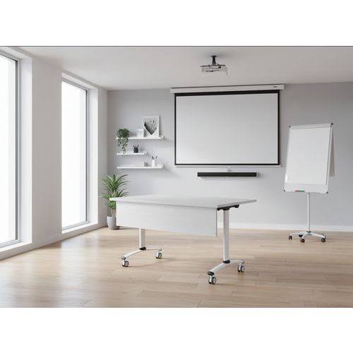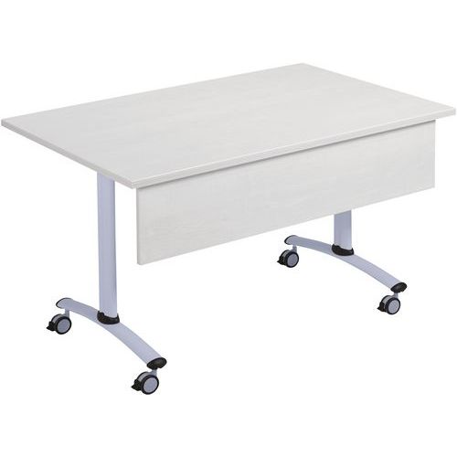 Mesa de reunião retangular dobrável com painel frontal Axe com tampo basculante que permite poupança de espaço no armazenamento. O tampo laminado permite refeições e limpeza com água e sabão. Bloqueio automático do tampo na posição de trabalho (horizontal) e na posição vertical (armazenamento). Sistema de ligação rápida entre tampos através de parafuso de aperto manual. Equipada com 4 rodas Ø 75 mm com travão. Altura do painel de fundo de 25 cm. Cantos em ABS com 2 mm de espessura. Base em metal lacado a epóxi. Produto fabricado em França. Produto fornecido com os pés desmontados.