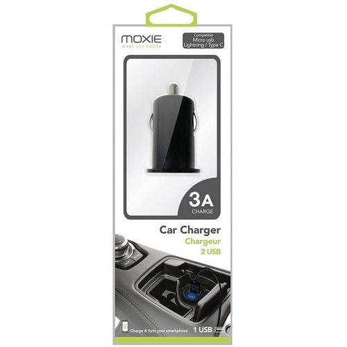 | Nome do artigo | Minicarregador-isqueiro universal com 2 entradas USB – Moxie, Cores: Preto |